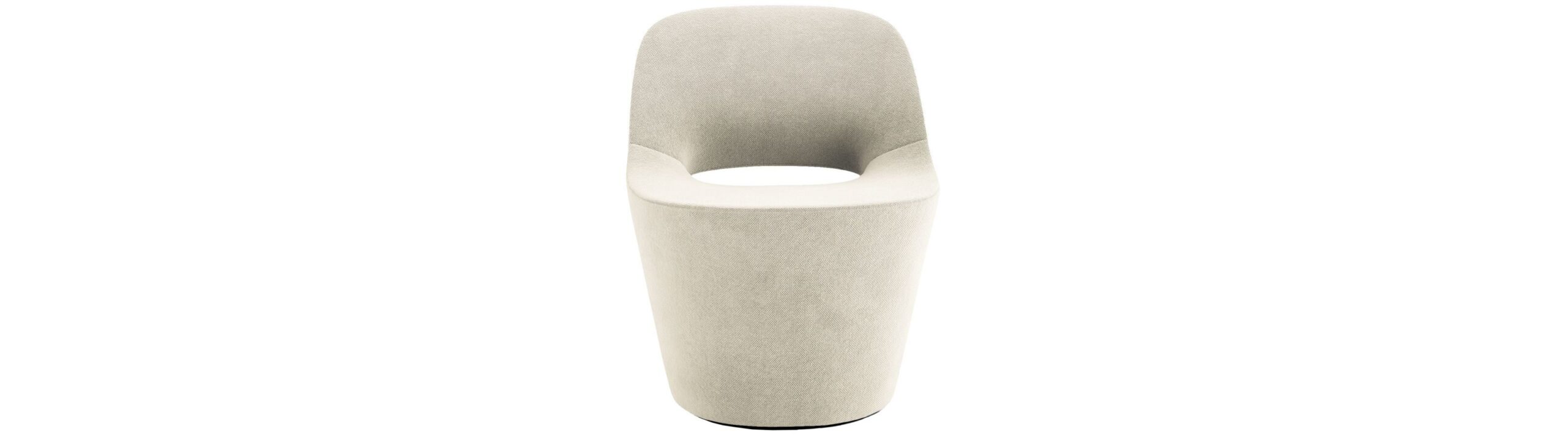 Designed by the British studio PearsonLloyd, Eddy stands out for its strongly expressive lines. Its rounded form is interrupted only by the distinctive cut between the backrest and seat, which serves as a focal point in the uninterrupted aesthetic of the model, while also providing a functional grip for moving the chair. Available in two versions, with legs or a rotating round base, it offers a broad colour palette to experiment with contrasting profiles or tone-on-tone combinations.