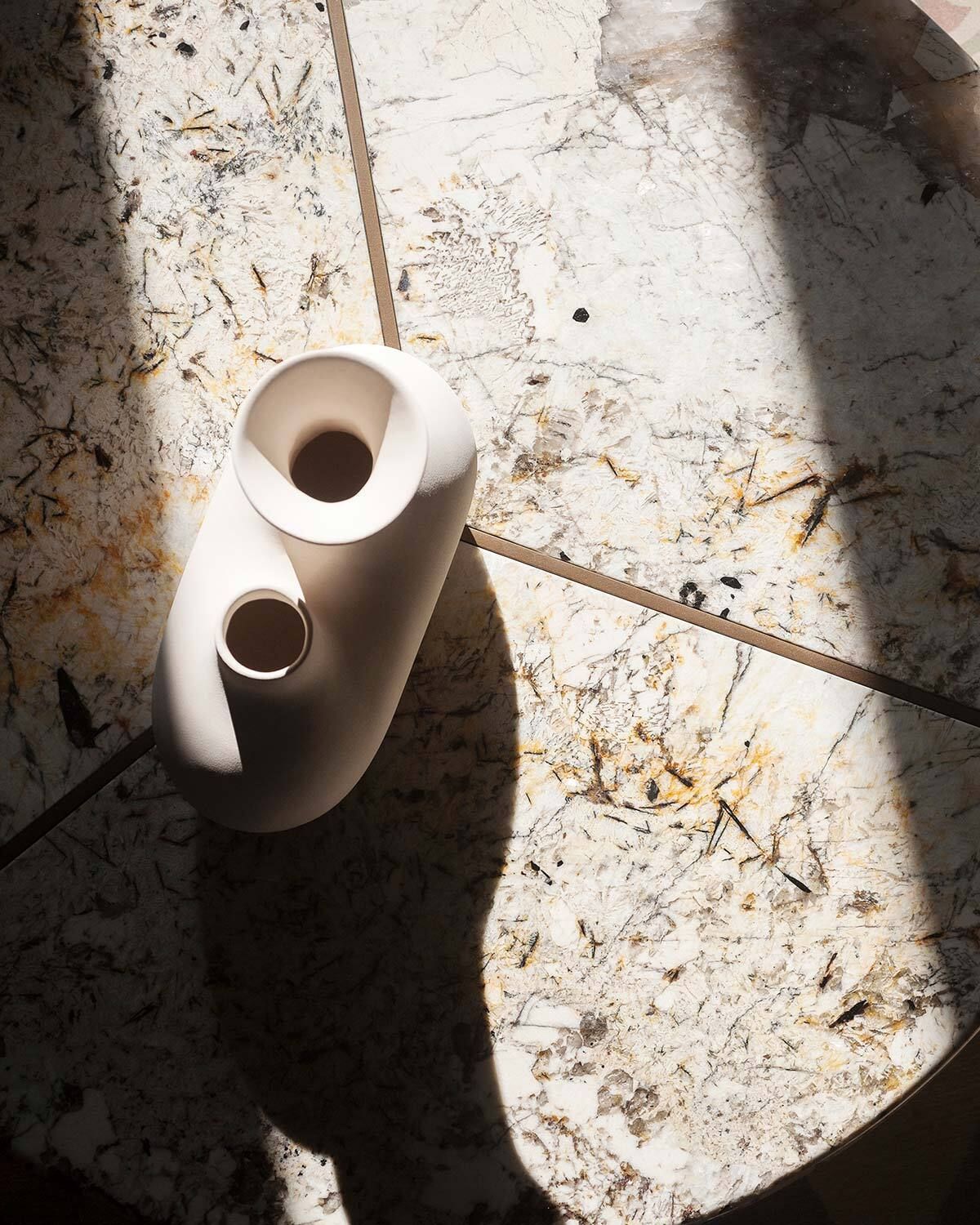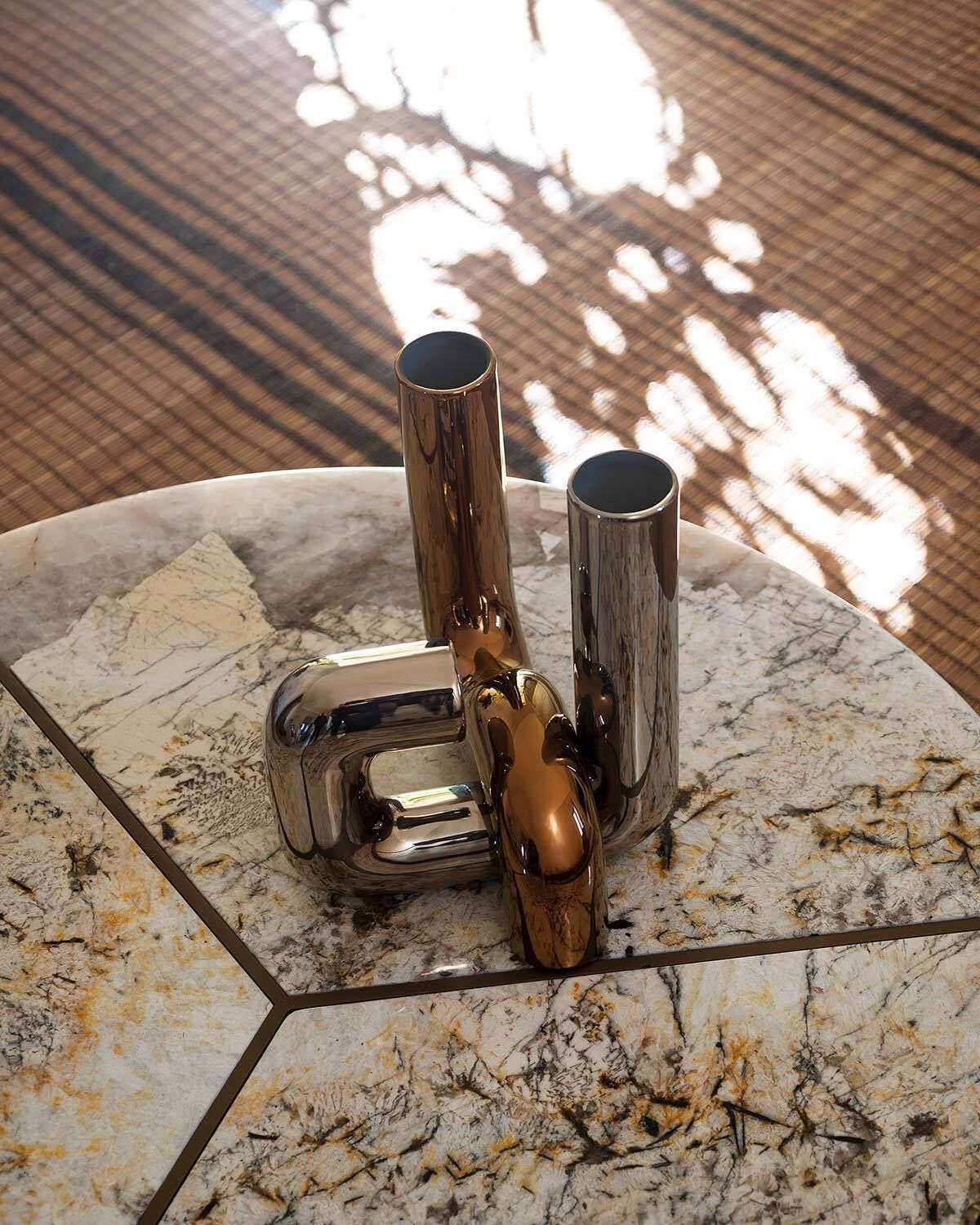 For the Joaquim side tables, Giorgio Bonaguro looks to the furniture designed for the modernist architecture of Niemeyer, Costa, Vilanova Artigas, and Bo Bardi. The geometric, linear forms of the tables pay tribute to the simple yet elegant lines of Joaquim Tenreiro – considered one of the fathers of modern tropical design – while the recycling of production waste, in line with contemporary principles of creative recycling and eco-sustainability, is evident in their construction, from the metal frame to the marble tops and bases.