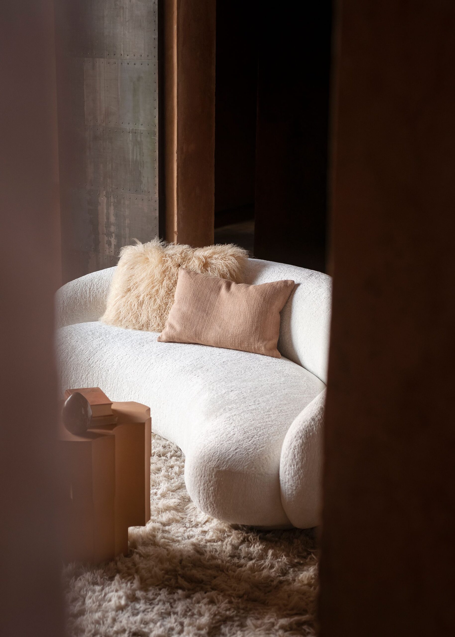 Julep is an upholstered sofa with soft, enveloping forms, inspired by the Avant-Garde of the 1950s, from which it draws simplicity and grandeur, softened with a contemporary, romantic, and feminine allure.